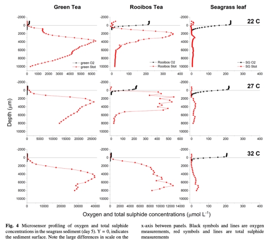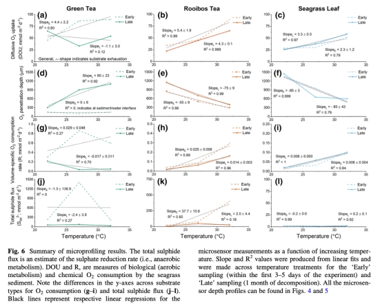 2. 氧氣(O2)微剖面與通量(圖4, 圖5, 圖6a-i):使用O2微電極測(cè)量了沉積物-水界面的O2濃度梯度,計(jì)算了擴(kuò)散氧吸收速率(DOU)和體積比耗氧速率(R)。研究意義:揭示了分解過程中的好氧微生物代謝活性。數(shù)據(jù)顯示,綠茶在分解早期耗氧速率最高,且升溫(至27°C)進(jìn)一步增強(qiáng)了耗氧活性;表明易分解底物和高溫共同刺激了好氧呼吸。