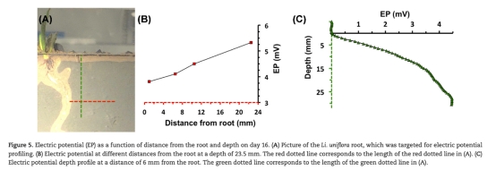 ? 結(jié)果:距離L. uniflora根系21.5 mm處電勢增加1.5 mV(圖5B),8 mm處增加3.4 mV,垂向電勢隨深度增加(圖5C)。