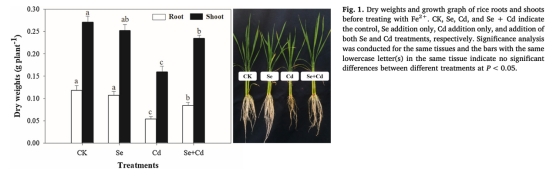 1. 干重:來自圖1。研究意義:Cd脅迫顯著抑制水稻根和地上部的干重(根減少54.3%,地上部減少41.1%),而Se緩解了這種抑制(根增加56.5%,地上部增加46.9%)。該數據表明Se能減輕Cd對生長的毒性影響,突出了Se的生物保護作用。
