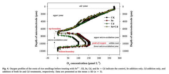 使用丹麥Unisense電極測量的氧剖面數據具有重要研究意義:它直接量化了根際微氧化區的氧濃度分布,包括最大O2濃度和微氧化區深度,從而精確評估了徑向氧損失(ROL)的變化。這種測量方法提供了原位證據,證明Cd脅迫會減少ROL(如最大O2濃度降低43.3%),而硒能逆轉這一效應(增加29.8%)。ROL是鐵膜形成的驅動力,因為氧促進Fe2+氧化為Fe3+并沉積在根表面。因此,這些數據不僅解釋了硒如何通過增強ROL促進鐵膜形成,還為開發減少水稻Cd積累的策略(如硒肥應用)提供了機制基礎,強調了根際氧化過程在重金屬修復中的重要性。