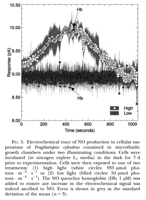 3. 光調控研究: 在微流體室中精確控制光照條件(黑暗、低光、高光),并結合光合抑制劑DCMU處理,研究光照及光合電子傳遞對NO產生的影響。