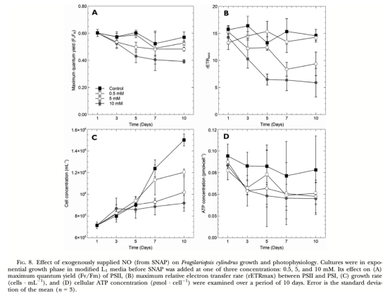 3. 生長數據 (細胞濃度,圖8C): 意義: 外源NO顯著抑制藻細胞生長(圖8C),證明其對細胞增殖有毒性。