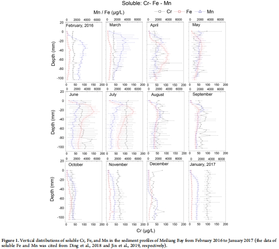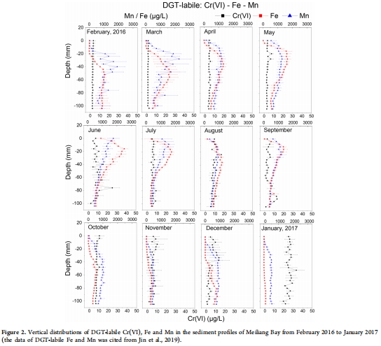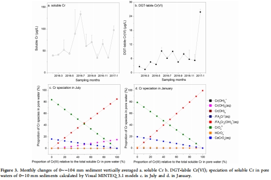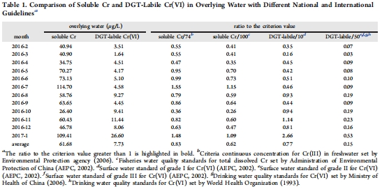 來源:月度變化的垂直分布數據來自圖1(可溶性Cr)和圖2(DGT有效態Cr(VI))。月度平均濃度的對比顯示在圖3a和3b。與水質標準的對比見表1。