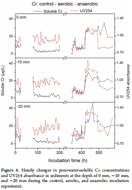 意義:好氧-厭氧實驗中的每小時數據(圖4)直接證明了厭氧條件下DOM(通過UV254指示)的增加與可溶性鉻濃度的同步上升存在顯著正相關,強有力地支持了夏季Cr(III)-DOM絡合的主導機制。藍藻添加實驗(圖5)顯示了藍藻生命活動如何改變鉻遷移的晝夜節律。