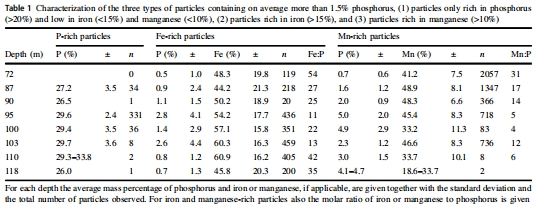 意義:識別出三類顆粒:富磷顆粒(P>20%, Fe<15%, Mn<10%)、富鐵顆粒(Fe>15%)、富錳顆粒(Mn>10%)。富磷顆粒的磷含量(27-30%)遠高于富鐵/錳顆粒(1.1-5.0%),且低金屬含量表明其生物來源(如polyP)。