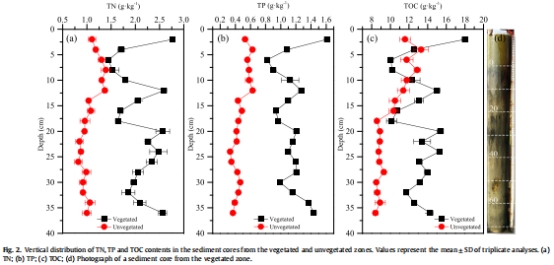 沉積物基本參數(shù)(TOC、TN、TP)垂直分布: