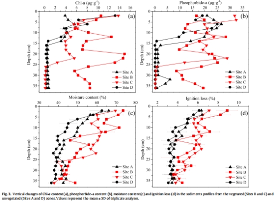 意義:植被區(qū)Chl-a和pheophorbide-a含量更高(均值6.39和15.98 μg·g?1),直接證明藍(lán)藻碎屑的大量沉積。水分和灼燒失重的高值進(jìn)一步支持有機(jī)質(zhì)富集。