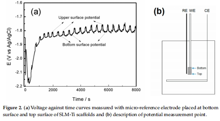 數據來源:圖2 展示了使用Unisense微電極測量的SLM-Ti支架頂部和底部表面電位隨時間的變化曲線。