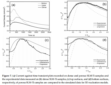 研究意義:這些數據從動力學層面揭示了機理差異。結果表明,沉積受擴散控制。更重要的是,圖7 的擬合結果證明:二維平板和支架底部表面符合瞬時成核模型,而支架頂部表面更符合連續成核模型。這深刻說明,由于內部電位降,支架不同位置所處的電化學環境截然不同,從而導致成核機制發生根本性變化。