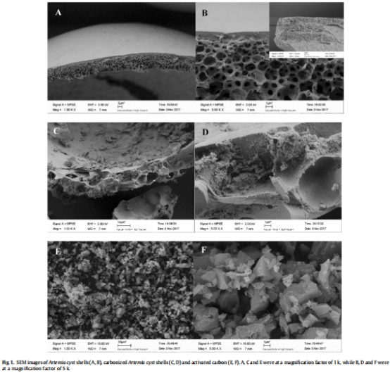 數(shù)據(jù)來源:圖1 的SEM圖像展示了鹵蟲卵殼、碳化后LC以及商用AC的微觀形貌。