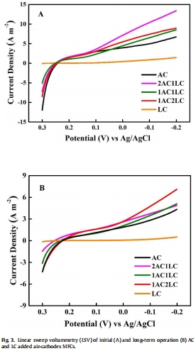 陰極制備與電池構(gòu)建:將LC與AC以不同質(zhì)量比(如2:1, 1:1, 1:2)混合,采用滾壓法制備一系列空氣陰極。構(gòu)建單室MFC反應(yīng)器,并以這些陰極為核心進(jìn)行長(zhǎng)期(超過8800小時(shí))運(yùn)行。