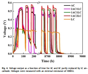將碳化鹵蟲卵殼(LC)作為添加劑引入AC空氣陰極,能顯著緩解MFC的長(zhǎng)期功率衰減。