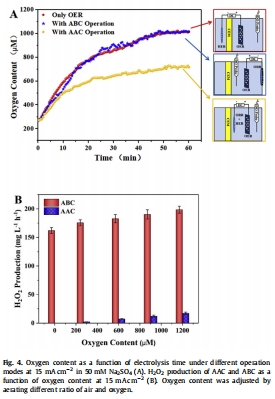 研究意義:圖3A 清晰表明,AAC陰極的H?O?產率隨電流密度增加而急劇下降,副反應(產氫)加劇。而圖3B 顯示ABC陰極的產率隨電流密度穩定上升。這強有力地證明了對于高比表面積的多孔陰極,依靠GDL從氣相直接供給氧氣(ABC模式)遠比通過溶液擴散供氧(AAC模式)更高效,能避免在高電流下因局部缺氧導致的性能崩潰。