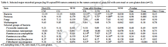 數(shù)據(jù):CG組R. amylophilus(淀粉分解菌)16S rRNA基因拷貝數(shù)降低(P = 0.003),真菌18S rRNA基因拷貝數(shù)(P = 0.05)和F. succinogenes(纖維分解菌)16S rRNA基因拷貝數(shù)增加(P = 0.03)。