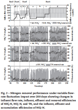 數據:在穩(wěn)定期(Run 2),NH4+和NO2-去除效率分別達93.5%和96.9%,TN去除率82.3%。在沖擊負荷期(Runs 4-6),系統能快速適應流量波動,恢復高去除率(>90%),適應時間隨頻率增加而延長(最高60天)。