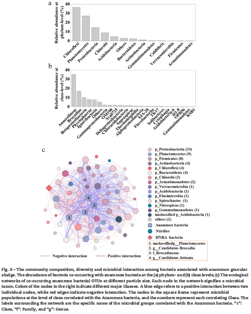 數據:qPCR顯示anammox細菌(hzsB基因)豐度達5.09×10^11 copies/g VSS,占總細菌30.7%。高通量測序揭示主導門為Chloroflexi(36.7%)、Planctomycetes(27.2%,含anammox菌)、Proteobacteria(14.7%)。網絡分析顯示73.8%的微生物相互作用為負相關(競爭)。