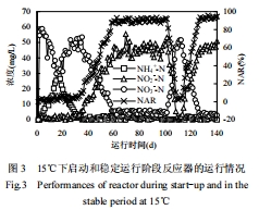 數(shù)據(jù):穩(wěn)定運(yùn)行階段(第57-99天),NH4+-N去除率近100%,NO3--N濃度維持在5 mg/L左右,NAR持續(xù)高于90%。提高DO至8 mg/L時短程硝化被破壞(NAR降至2.07%),恢復(fù)DO至5 mg/L后NAR回升至90.07%。