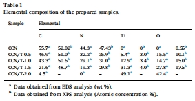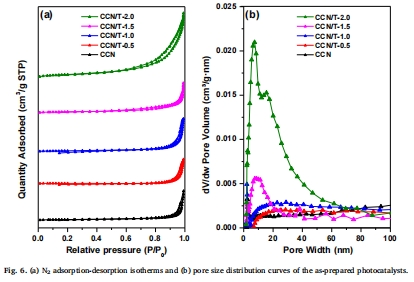 數據:BET分析顯示樣品為介孔結構(IV型等溫線),CCN/T-1.5比表面積較高(詳見表2),孔徑隨TiO2濃度增加而減小。