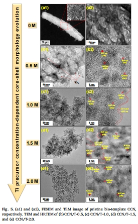 數據:FESEM和TEM圖像顯示,低TiO2濃度時CCN主導形貌,高濃度時出現TiO2納米棒核殼結構(CCN/T-1.5殼厚約1.0 nm)。