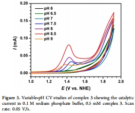 復合物3是一種有效的分子水氧化電催化劑,在中性至弱堿性pH(7-9)下操作,過電位約0.5 V,活性優于類似吡啶系統(如復合物1)。