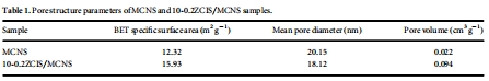 數(shù)據(jù):MCNS和10-0.2ZCIS/MCNS的比表面積分別為12.32和15.93 m2 g?1,平均孔徑約20 nm,呈介孔結(jié)構(gòu)。