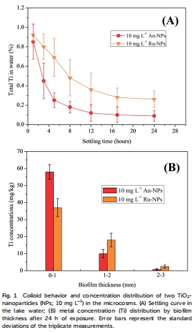 數(shù)據(jù):沉降曲線(Fig. 1A)顯示An-NPs在12小時內(nèi)快速沉降,而Ru-NPs沉降較慢;Ti分布(Fig. 1B)顯示An-NPs主要沉積在生物膜表面(<1 mm,75.2 mg kg?1),Ru-NPs能滲透更深(56.4 mg kg?1)。