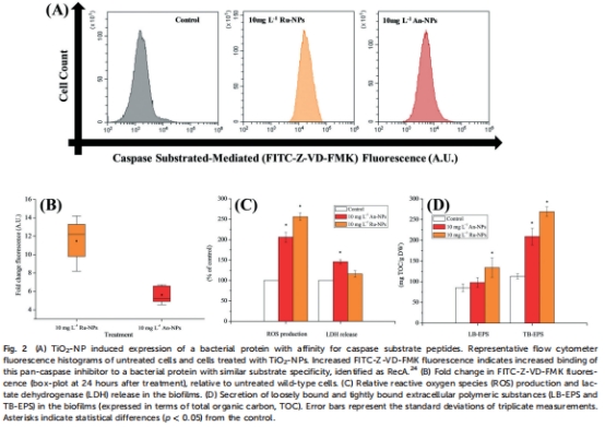揭示不同晶型TiO2-NPs(An-NPs和Ru-NPs)對淡水生物膜的毒性機制差異,包括細胞死亡模式、ROS產(chǎn)生和抗氧化響應(yīng)。