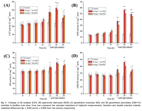 研究意義:IBR綜合了多種酶活性,有效評估生物膜健康狀態(tài)。An-NPs的急性效應(yīng)與光氧化相關(guān),Ru-NPs的漸進毒性與滲透和細胞內(nèi)ROS相關(guān)。