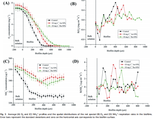 研究意義:微電極提供高分辨率代謝數(shù)據(jù),顯示TiO2-NPs普遍抑制氨氧化,但氧抑制僅限于上層。Ru-NPs對氨氧化的抑制更強, due to更深滲透。