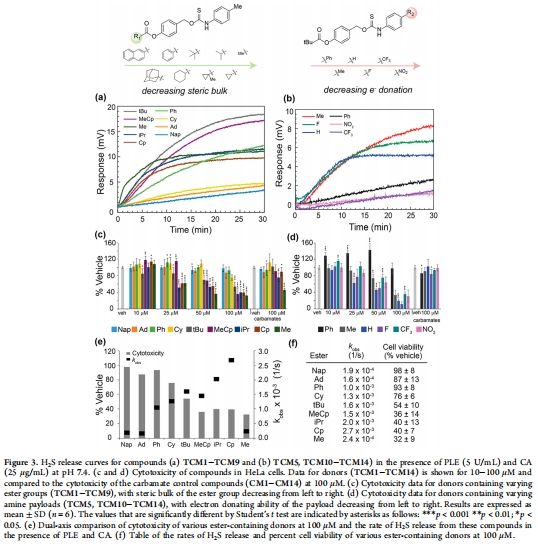 數據:Figure 3a顯示,酯基立體體積較小的供體(如TCM1,甲基酯)H2S釋放速率快(峰值高且早),而體積大的供體(如TCM9,萘基酯)釋放慢。Figure 3b顯示,胺負載電子性質變化(如TCM14含-NO2基團)也影響釋放速率,電子給體或吸電子基團均減緩釋放。