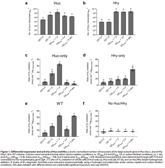 數據:qRT-PCR顯示hucL在碳限制過渡期(1天 post-Amax)表達峰值(54倍誘導),隨后下降;hhyL在持久期(3周 post-Amax)高表達。H2氧化速率測量表明Huc活性在過渡期最高,Hhy活性在持久期顯著增強。