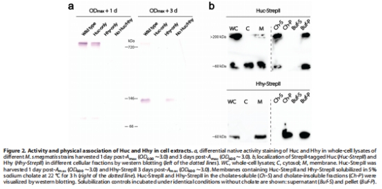 數據:活性染色顯示Huc形成高分子質量復合物(>700 kDa),Hhy為中分子質量(~66 kDa);Western blotting 顯示Huc部分膜關聯(膽酸鈉可溶),Hhy強膜關聯(膽酸鈉不溶)。