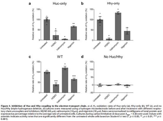 數據:微電極測量顯示H2氧化依賴O2, stoichiometry 約2:1(H2:O2);抑制劑實驗表明鋅疊氮(cytochrome bcc-aa?抑制劑)強烈抑制Huc活性(8.4倍降低),對Hhy影響?。?.5倍降低)。