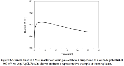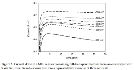 數據:S. ovata細胞懸浮液中,-900 mV時H2演化速率僅0.11±0.02 μM/min,電子回收率8.5±1.5%,但乙酸產量6.6±0.2 μM,庫倫效率75±3%。
