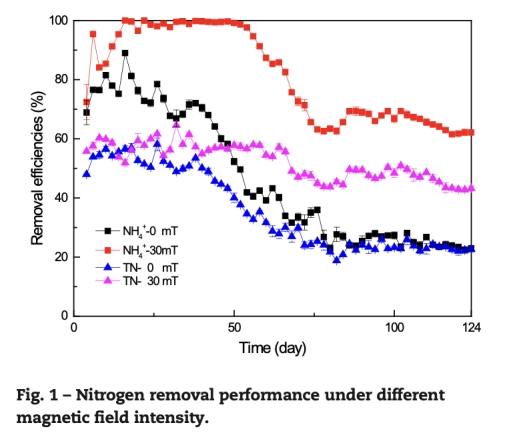 1 磁場應用(30 mT)在低溫(10°C)下顯著抑制SBR的N2O轉化率(降低34.3%)并提高脫氮效率(TN和NH4-N去除率分別增加22.4%和39.5%)。