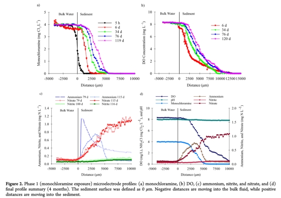 研究思路是使用Teflon杯反應(yīng)器填充2厘米深沉積物,連續(xù)暴露于4 mg L?1單氯胺或游離氯,流速5 mL min?1,分為三個(gè)階段:?jiǎn)温劝繁┞?個(gè)月(階段1)、游離氯暴露2個(gè)月(階段2)和再單氯胺暴露2個(gè)月(階段3)。使用微電極測(cè)量沉積物內(nèi)部從 bulk 流體到底部的單氯胺、游離氯、溶解氧、pH、銨、亞硝酸鹽和硝酸鹽的剖面。通過數(shù)學(xué)建模分析擴(kuò)散過程,并與測(cè)量數(shù)據(jù)比較,以理解化學(xué)傳輸和反應(yīng)。