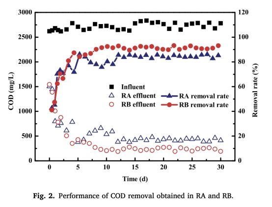 1 COD去除數據:來自圖2,顯示RB的COD去除效率達90.3%,高于RA的82.1%。研究意義是證明載體提供的缺氧微環境增強了難降解有機物的生物降解,提高了碳去除效率,為焦化廢水處理提供了更高效的方法。