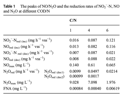 1 COD、NO2-N、pH、DO、NO和N2O的動(dòng)態(tài)變化數(shù)據(jù),來(lái)自圖1、圖2和圖3。研究意義:這些數(shù)據(jù)揭示了不同條件下NO和N2O的積累模式和速率,幫助識(shí)別關(guān)鍵影響因素如pH和負(fù)荷,為控制積累提供依據(jù)。