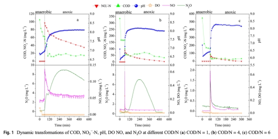 研究采用實(shí)驗(yàn)室規(guī)模SBR反應(yīng)器,培養(yǎng)反硝化污泥,進(jìn)行一系列批次測(cè)試。實(shí)驗(yàn)分為三部分:測(cè)試不同COD/N(1、4、6)對(duì)積累的影響;測(cè)試不同初始pH(6、7、8、9、10)的影響;測(cè)試不同進(jìn)水負(fù)荷(如90:22.5、180:45、360:90、720:180,COD:NO2-N)的影響。通過(guò)實(shí)時(shí)監(jiān)測(cè)參數(shù)如COD、NO2-N、pH、DO、NO和N2O,并結(jié)合功能基因定量分析,探討積累機(jī)制。