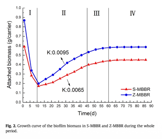 2 生物膜附著量數據:來自表1和圖2,顯示Z-MBBR的附著生物量(0.470±0.131 g/g載體)比S-MBBR(0.355±0.099 g/g載體)高1.3倍,且生物量增長曲線表明Z-MBBR在快速生長期(10-45天)的增長率更高(0.0095 g/(載體·天))。研究意義是表明新型載體提供更佳微生物附著環境,支持更高生物量和代謝活性,從而提升系統性能。