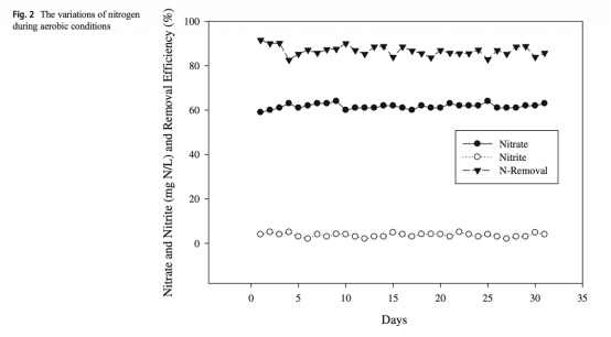 2 氮去除數據:來自圖2(好氧)和圖5(厭氧),顯示好氧條件下硝酸鹽去除率為83-90%,厭氧條件下為96-98%。研究意義是揭示好氧條件下DNRA路徑主導,厭氧條件下反硝化路徑主導,幫助理解氮轉化機制。