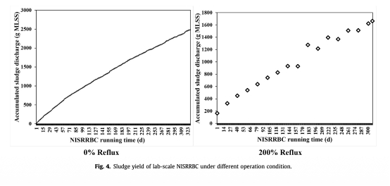 2 污泥產(chǎn)量數(shù)據(jù),來(lái)自Fig.4。研究意義:200%回流時(shí)污泥產(chǎn)量減少33.03%(平均5.07 g MLSS/d),污泥排放頻率從每12小時(shí)降至每20天一次,降低了運(yùn)營(yíng)成本和處理負(fù)擔(dān),適合缺乏專業(yè)人員的農(nóng)村地區(qū)。