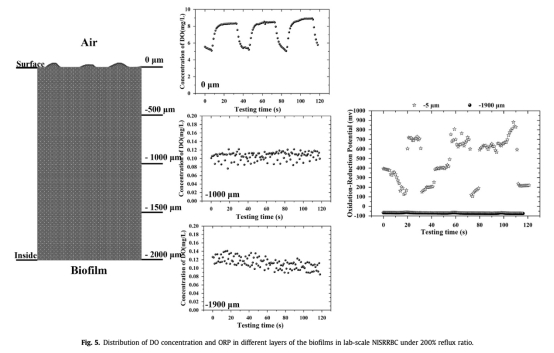 本研究使用丹麥Unisense微電極(型號(hào)PA2000,尖端直徑10μm)在線測(cè)量生物膜內(nèi)的溶解氧(DO)和氧化還原電位(ORP)。研究意義在于:這些高精度測(cè)量數(shù)據(jù)實(shí)時(shí)揭示了生物膜內(nèi)部的微環(huán)境分層動(dòng)態(tài)。如圖5所示,DO和ORP從表層到深層呈現(xiàn)梯度變化,明確劃分出好氧、缺氧和厭氧區(qū)域。這種分層結(jié)構(gòu)解釋了回流如何通過(guò)增強(qiáng)氧和底物擴(kuò)散,促進(jìn)硝化菌(好氧區(qū))和反硝化菌(缺氧區(qū))的協(xié)同作用,從而顯著提升脫氮效率。此外,ORP數(shù)據(jù)(從正値到負(fù)値)進(jìn)一步驗(yàn)證了厭氧條件的存在,支持了TN去除的機(jī)制。Unisense電極的數(shù)據(jù)為優(yōu)化NISRRBC操作提供了關(guān)鍵依據(jù),證實(shí)回流策略能有效調(diào)控生物膜微環(huán)境,實(shí)現(xiàn)高效低耗的農(nóng)村污水處理。