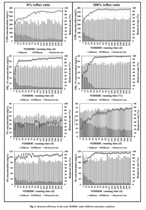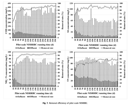 5 中試性能數(shù)據(jù),來(lái)自Fig.7和Fig.8。研究意義:中試NISRRBC的COD、SS、NH4-N和TN去除率分別達(dá)89.21%、88.92%、93.06%和76%,出水符合排放標(biāo)準(zhǔn),且污泥排放次數(shù)少(一年僅12次),驗(yàn)證技術(shù)可行性和穩(wěn)定性。