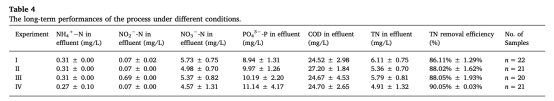 1 長(zhǎng)期性能數(shù)據(jù),包括COD、NH4+-N、NO3--N、NO2--N、PO43--P和TN的出水濃度及去除效率,來(lái)自Fig. 2和Table 4。研究意義在于驗(yàn)證好氧反硝化過(guò)程在較高碳氮比(10)下能實(shí)現(xiàn)高效總氮去除(86.11%-90.05%),表明過(guò)量碳源可刺激電子傳遞鏈,提升脫氮效率。