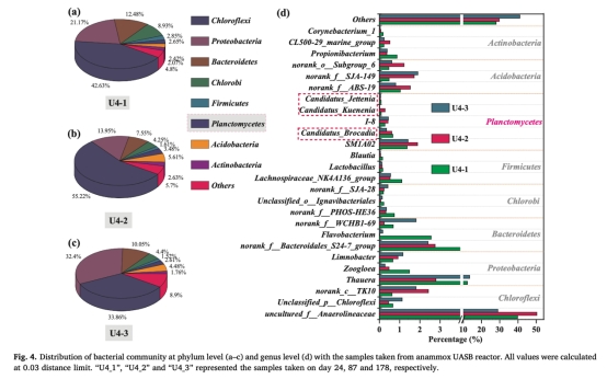 3 微生物群落數(shù)據(jù),如高通量測序結(jié)果,顯示Planctomycetes、Chloroflexi等菌門比例,來自Fig. 4。研究意義在于揭示Anammox菌(如Candidatus_Brocadia)為主導(dǎo),盡管存在異養(yǎng)菌,但過程仍穩(wěn)定,幫助理解微生物機(jī)制。