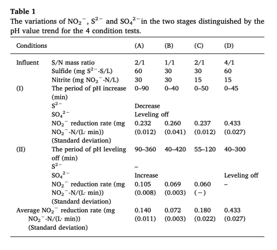 2 pH、硫化物、硫酸鹽濃度數據,來自Fig. 1和Table 1。研究意義在于區分硫化物氧化的兩個階段(先氧化為S0再氧化為SO4^2-),pH變化作為階段劃分指標,幫助理解反應進程和效率。