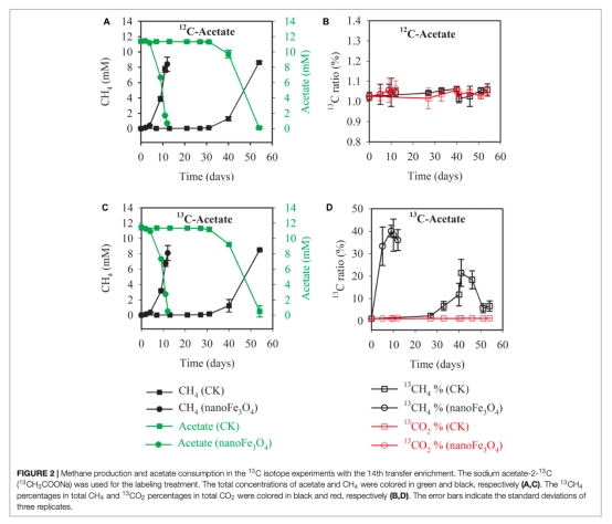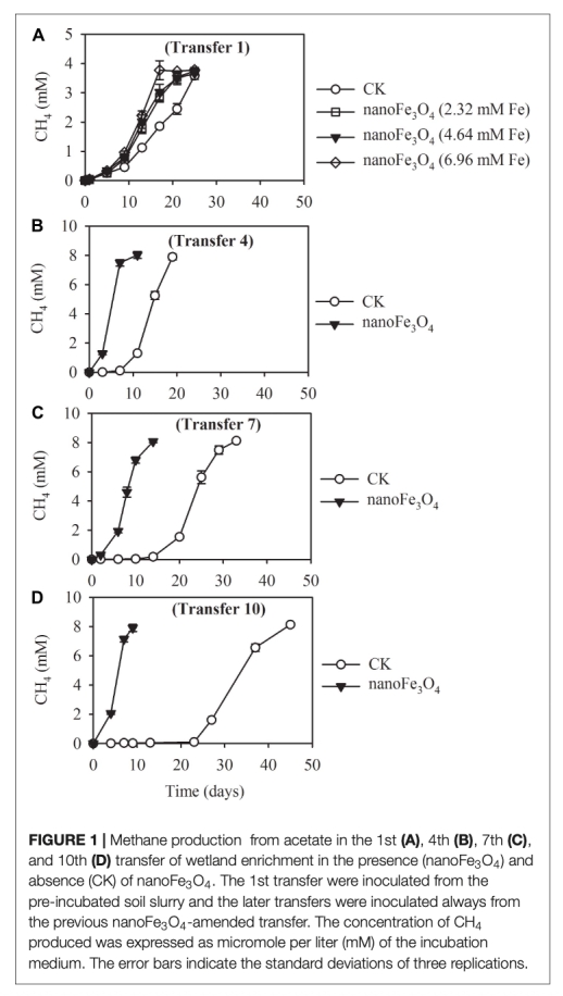 1 甲烷產(chǎn)量和乙酸消耗數(shù)據(jù):來自Figure 1和Figure 2。數(shù)據(jù)顯示,添加納米Fe3O4顯著縮短了產(chǎn)甲烷的滯后期并提高了最大產(chǎn)甲烷速率,且在富集培養(yǎng)和純培養(yǎng)中均觀察到促進作用。研究意義在于直接證明了納米Fe3O4對乙酸營養(yǎng)型產(chǎn)甲烷的增強效應(yīng),而非通過促進互營途徑。