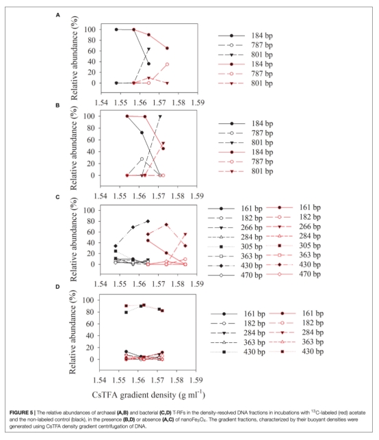 3 微生物群落分析數(shù)據(jù):來自Figure 4、Figure 5和Figure 6。通過DNA-SIP和T-RFLP分析,顯示甲烷八疊球菌(Methanosarcina)是主要的產(chǎn)甲烷菌,且納米Fe3O4處理下Azonexus等細菌相對豐度變化。研究意義在于表明納米Fe3O4促進了特定功能微生物的富集,可能與電子傳遞相關(guān)。