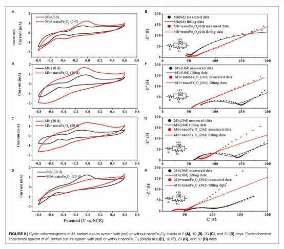 4 電化學(xué)分析數(shù)據(jù):來自Figure 8。循環(huán)伏安法(CV)顯示添加納米Fe3O4后系統(tǒng)電容增加,電化學(xué)阻抗譜(EIS)顯示電子傳遞電阻降低。研究意義在于表明納米Fe3O4增強了系統(tǒng)的氧化還原活性和電子傳遞效率,支持其作為電子穿梭體的角色。
